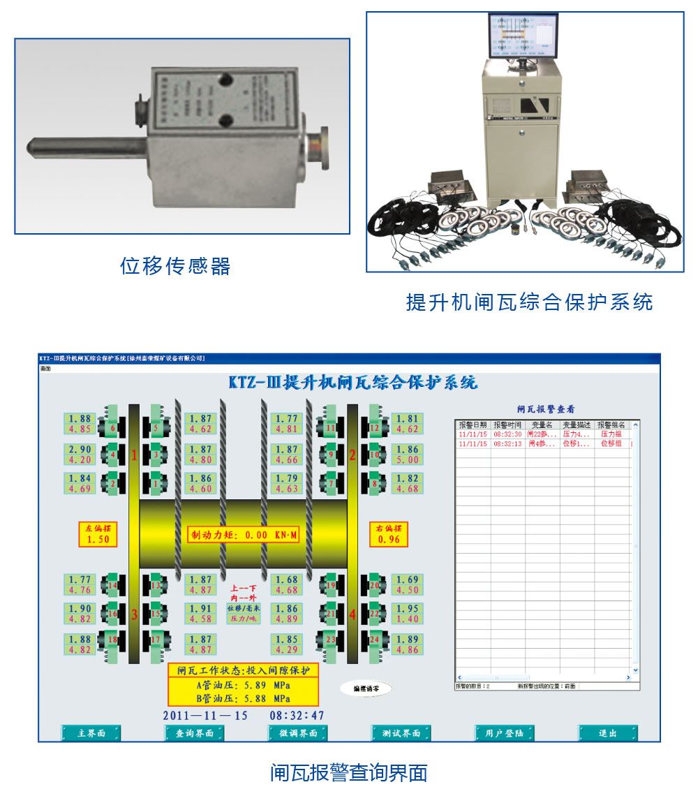 提升機制動器閘間隙報警裝置,通過接觸式閘間隙傳感器、貼閘壓力傳感器、電磁換向閥動作傳感器和油壓傳感器, 對制動裝置運行參數例如閘間隙、 貼閘壓力、碟形彈簧曲線、油壓等進行實時在線監測、數字化顯示,設置了電磁換向閥憋卡、閘間隙超限等故障預測和報警功能,若監測到使安全緊急制動失靈的信號,如電磁閥換向閥卡死無法泄油制動等, 直接參與控制,自動打開緊急回路泄油制動,避免事故發生。
