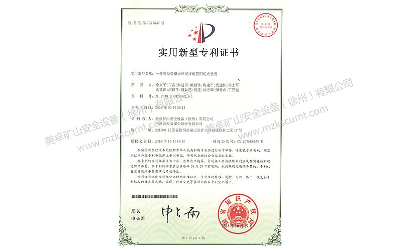 隔爆永磁同步滾筒用逆止裝置專利證書